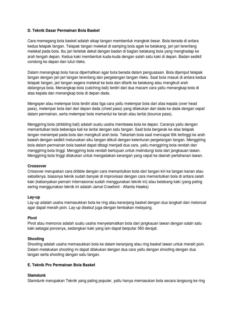 Keliling bola antara 75 cm s.d. Pertama kali ditemukan permainan bolabasket bertujuan untuk menghilangkan kelesuan berolahraga pada musim dingin, dr. Teknik dasar bola basket dan penjelasannya. Melempar bola dari posisi di atas kepala. Menembak bola kekeranjang lawan dalam permainan bola basket termasuk gerak.